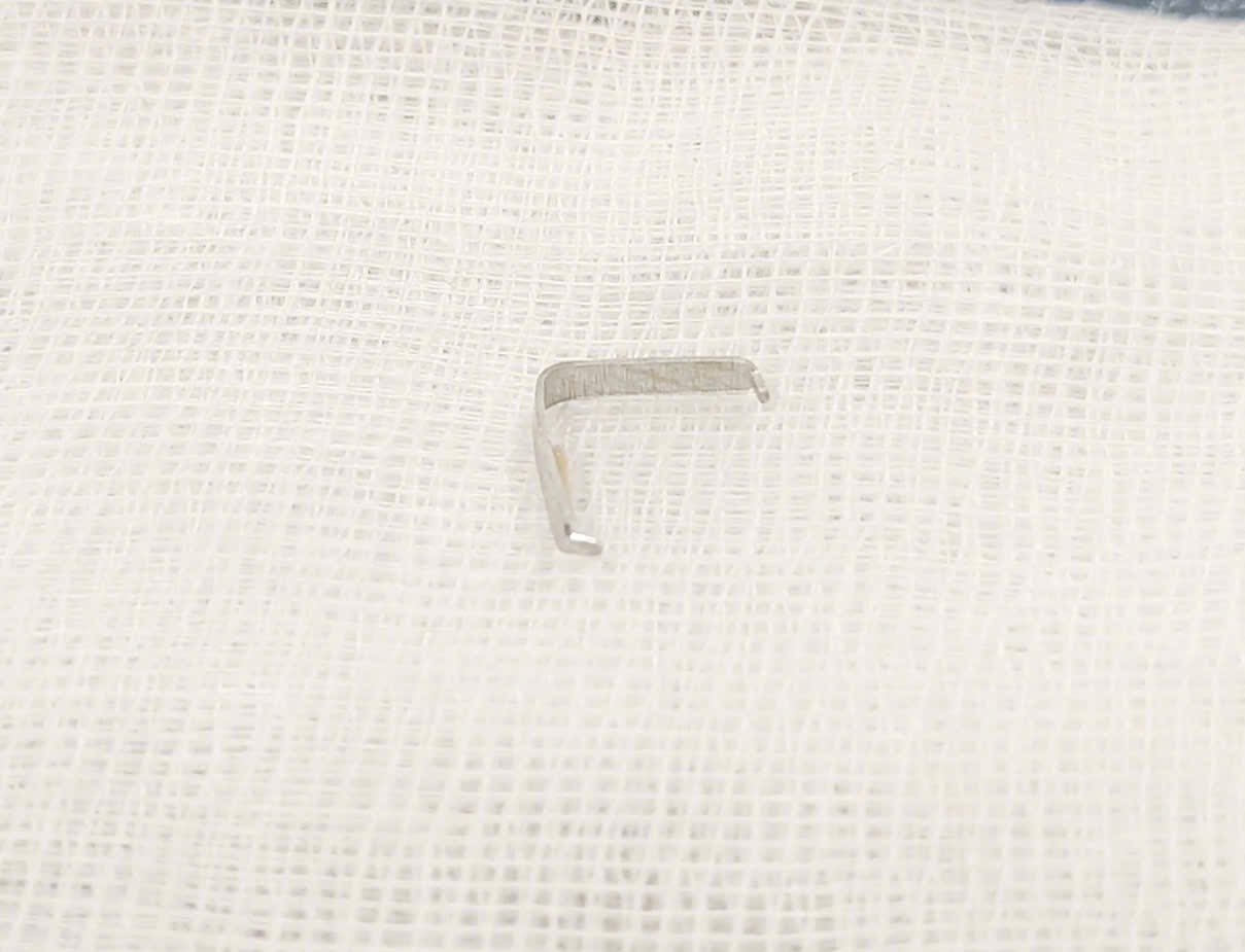 Tại phòng khám, qua thăm khám, các bác sĩ phát hiện một đầu dị vật găm vào niêm mạc trong má phải, mắc lại ở vùng họng miệng. Ê kíp đã nhanh chóng tiến hành gắp dị vật, xác định đó là một chiếc ghim tất bằng kim loại có hai đầu nhọn. Rất may, dị vật chưa trôi sâu xuống hạ họng hay thực quản nên mức độ tổn thương còn hạn chế. Vùng niêm mạc trong má phải chỉ bị xây xước nhẹ, chưa có dấu hiệu nhiễm trùng hay tổn thương sâu do được phát hiện sớm.