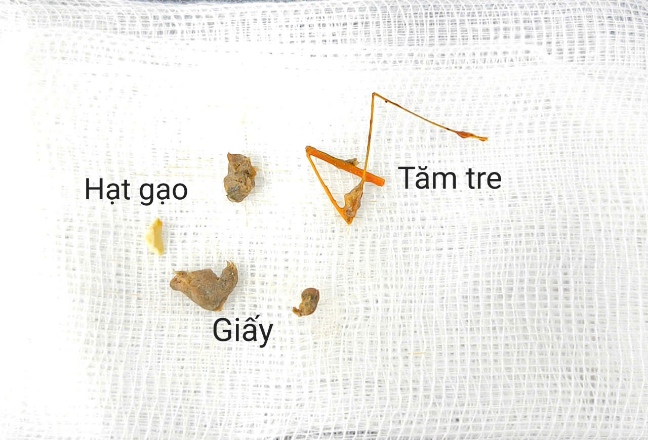 Tại phòng khám Tai Mũi Họng, các bác sĩ đã tiến hành nội soi và gắp dị vật. Kết quả ghi nhận 1 mảnh tăm tre, 3 cục giấy cuộn và một số dị vật nhỏ khác nằm sâu trong ống tai.
