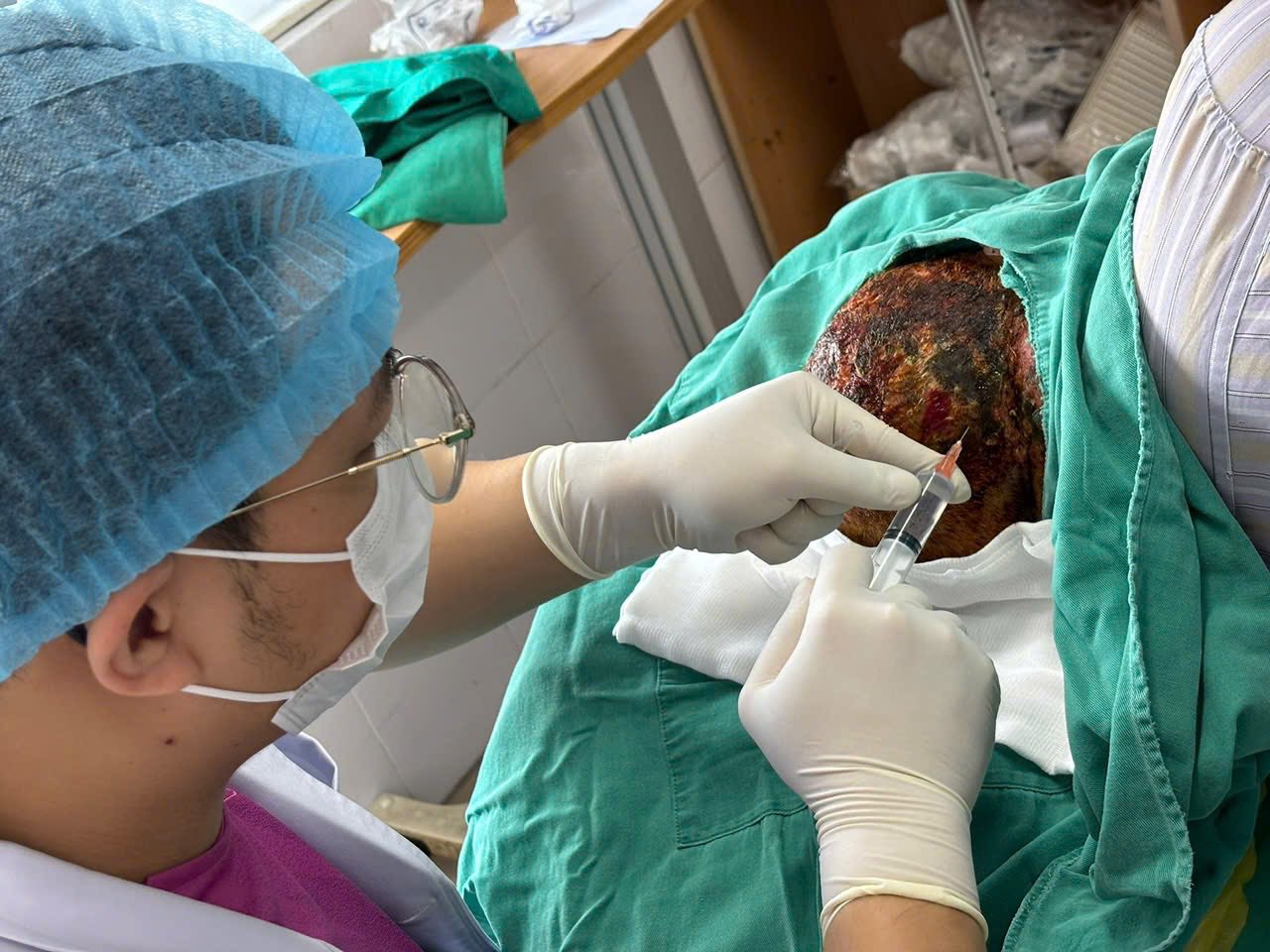 Rất may, sau 3 ngày điều trị tích cực, vết thương đã se lại, tiến triển tốt hơn. Khi ổn định, bệnh nhân sẽ được chuyển đến chuyên khoa Ngoại để tiến hành cắt bỏ phần tổn thương bị hoại tử sau gáy, vệ sinh vết thương và loại bỏ phần lá bám sâu vào da đầu.