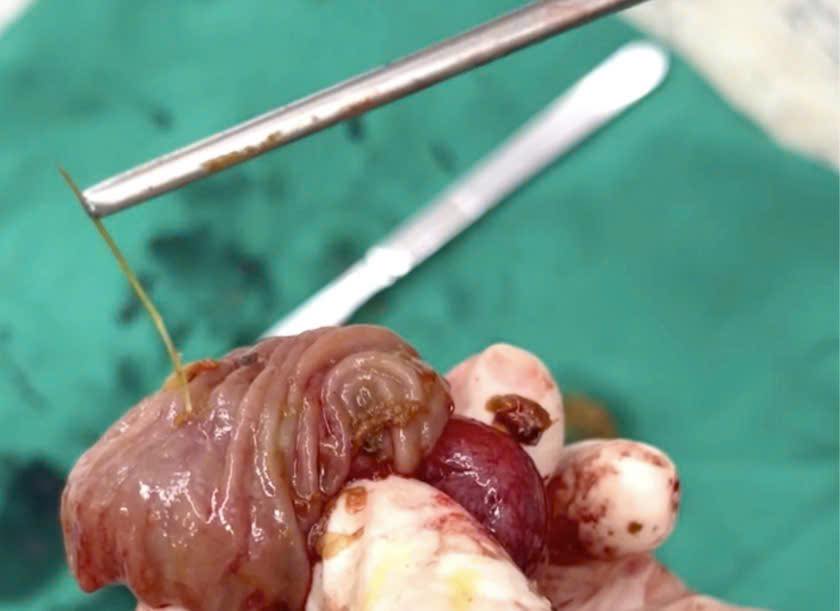 Trong khi mổ, ê kíp phẫu thuật phát hiện ổ bụng của bệnh nhân có dịch đục và bị nhiễm trùng nặng. Vùng tiểu khung, ruột thừa vị trí hố chậu phải viêm xung huyết. Một ổ áp xe tại đoạn ruột non vị trí cách góc hồi manh tràng khoảng 1 mét, nguyên nhân là mảnh xương cá dài 4 cm đâm thủng ruột non. Cách đó 10 cm, có một túi thừa Meckel lớn. Các bác sĩ đã cắt bỏ ruột thừa viêm, cắt đoạn ruột non chứa túi thừa và ổ áp xe, làm sạch ổ bụng. Sau phẫu thuật 2 ngày, bệnh nhân hồi phục tốt và sẽ sớm được xuất viện.